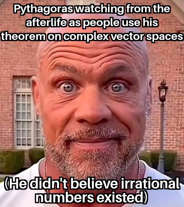 Pythagoras watching from the afterlife as people use his theorem on complex vector spaces. (He didn't believe irrational numbers existed)