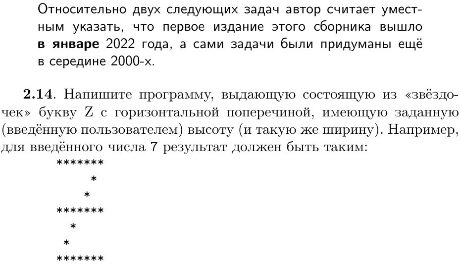 Относительно двух следующих задач автор считает уместным указать, что первое издание этого сборника вышло в январе 2022 года, а сами задачи были придуманы ещё в середине 2000-х. 2.14. Напишите программу, выдающую состоящую из «звёздочек» букву Z с горизонтальной поперечиной, имеющую заданную (введённую пользователем) высоту (и такую же ширину). Например, для введённого числа 7 результат должен быть таким: ******* * * ******* * * *******