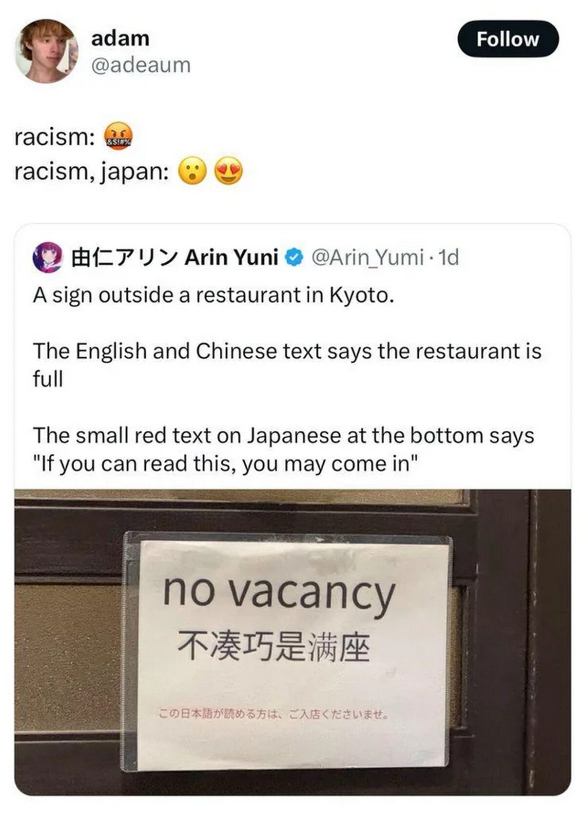 Мем представляет собой скриншот поста из Твиттера, в котором пользователь по имени Адам комментирует форму расизма в Японии. В твите приведена фотография таблички, вывешенной возле ресторана в Киото. На табличке крупным шрифтом на английском и китайском языках написано "no vacancy", что означает "нет свободных мест". Однако внизу таблички мелким красным шрифтом на японском языке написано: "Если вы можете это прочитать, вы можете войти". Этот пост намекает на скрытый расизм, где на первый взгляд ресторан кажется полным, но на самом деле он открыт для тех, кто понимает японский язык, что может быть барьером для иностранных посетителей.