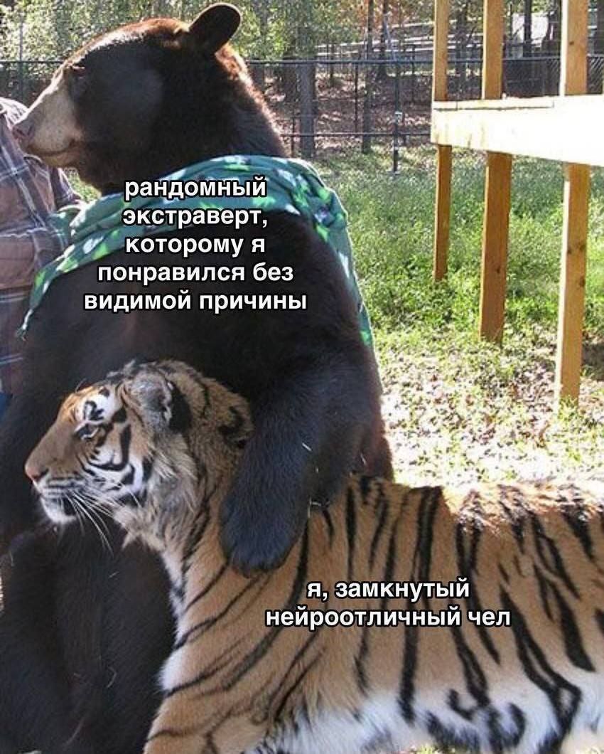 На изображении показан крупный черный медведь, обнимающий тигра. Медведь одет в зеленую накидку или попону, а тигр выглядит несколько озадаченным или неловким от такого объятия. Текст на медведе гласит: "рандомный экстраверт, которому я понравился без видимой причины" (случайный экстраверт, которому я понравился без видимой причины), а на тигре написано: "я, замкнутый нейроотличный чел" (я, замкнутый нейроотличный чувак). Эта сцена комично иллюстрирует динамику, когда очень открытый человек проявляет дружелюбие к более замкнутому и интровертному типу личности, который может быть нейроотличным.