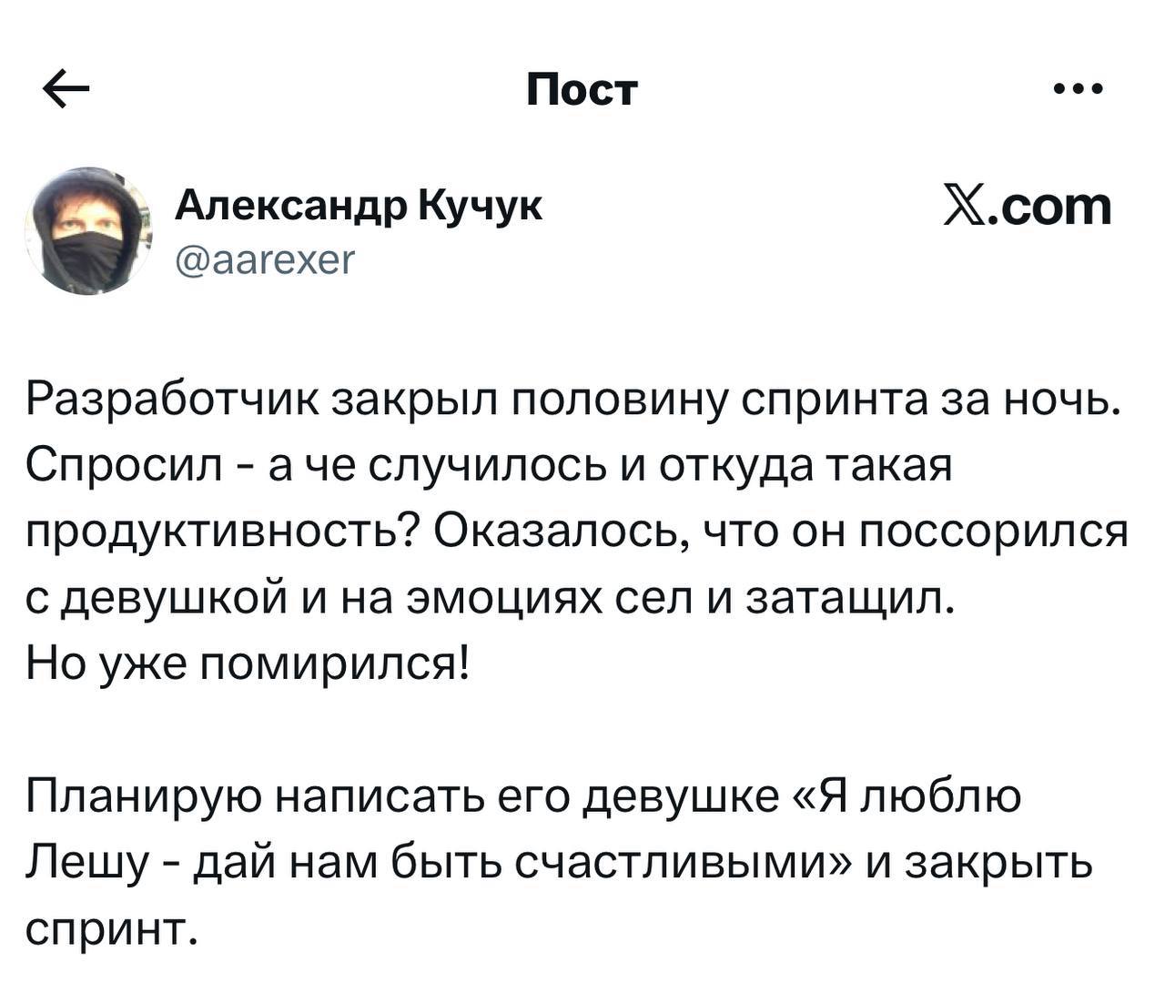 Пост. Александр Кучук @aarexer. X.com. Разработчик закрыл половину спринта за ночь. Спросил - а че случилось и откуда такая продуктивность? Оказалось, что он поссорился с девушкой и на эмоциях сел и затащил. Но уже помирился. Планирую написать его девушке "Я люблю Лешу - дай нам быть счастливыми" и закрыть спринт.