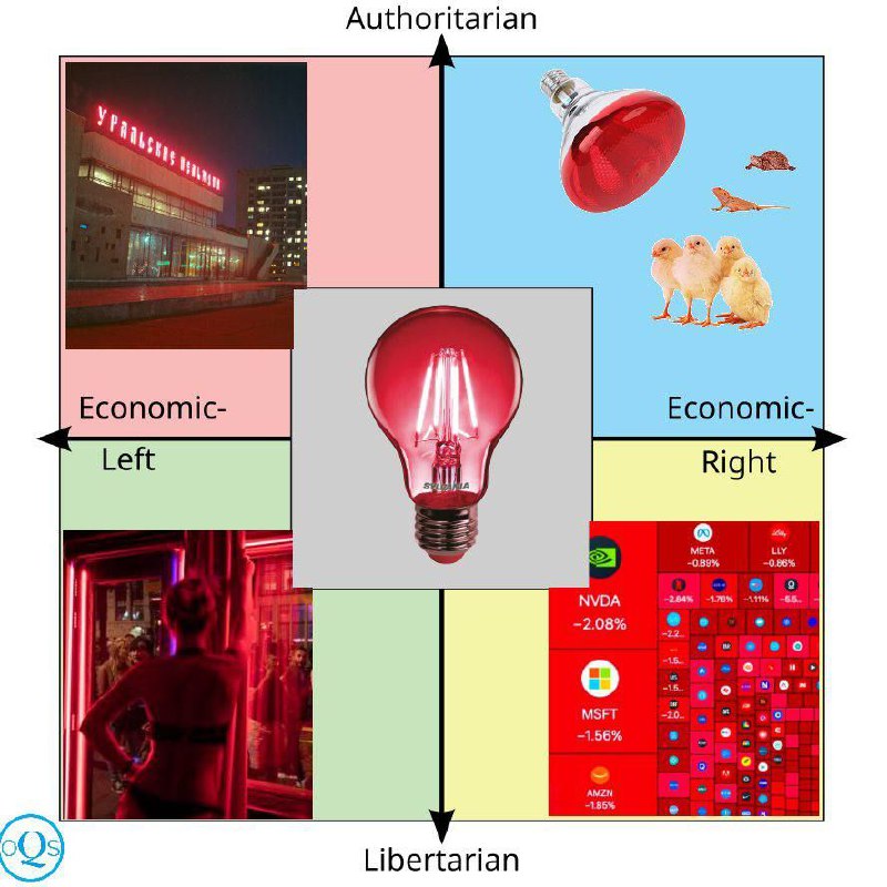 Мем представляет собой политический компас, разделённый на четыре квадранта: авторитарный, либертарианский, экономически левый и экономически правый. В центре компаса расположена красная лампочка, служащая общим элементом. В верхнем левом, авторитарно-левом квадранте, изображено советское здание "Уральские авиалинии" под красным освещением. В верхнем правом, авторитарно-правом квадранте, показана красная греющая лампа, под которой находятся цыплята, ящерица и черепаха. Нижний левый, либертарианско-левый квадрант, демонстрирует человека, стоящего в красном освещении, возможно, в ночном клубе или баре. В нижнем правом, либертарианско-правом квадранте, отображены различные иконки приложений и графики с падением акций крупных компаний, таких как NVIDIA, Microsoft, Amazon и Meta, все подсвеченные красным цветом. Кажется, мем обыгрывает различные аспекты политики и экономики, используя красное освещение как связующую тему.