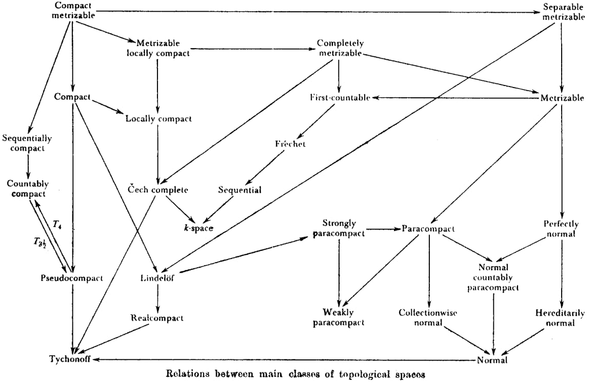 Compact metrizable. Separable metrizable. Metrizable locally compact. Completely metrizable. Compact. First-countable. Sequentially compact. Locally compact. Fréchet. Countably compact. Čech complete. Sequential. k-space. T₄. T₃½. Strongly paracompact. Pseudocompact. Paracompact. Lindelöf. Weakly paracompact. Perfectly normal. Realcompact. Collectionwise normal. Normal countably paracompact. Hereditarily normal. Tychonoff. Normal. Relations between main classes of topological spaces.