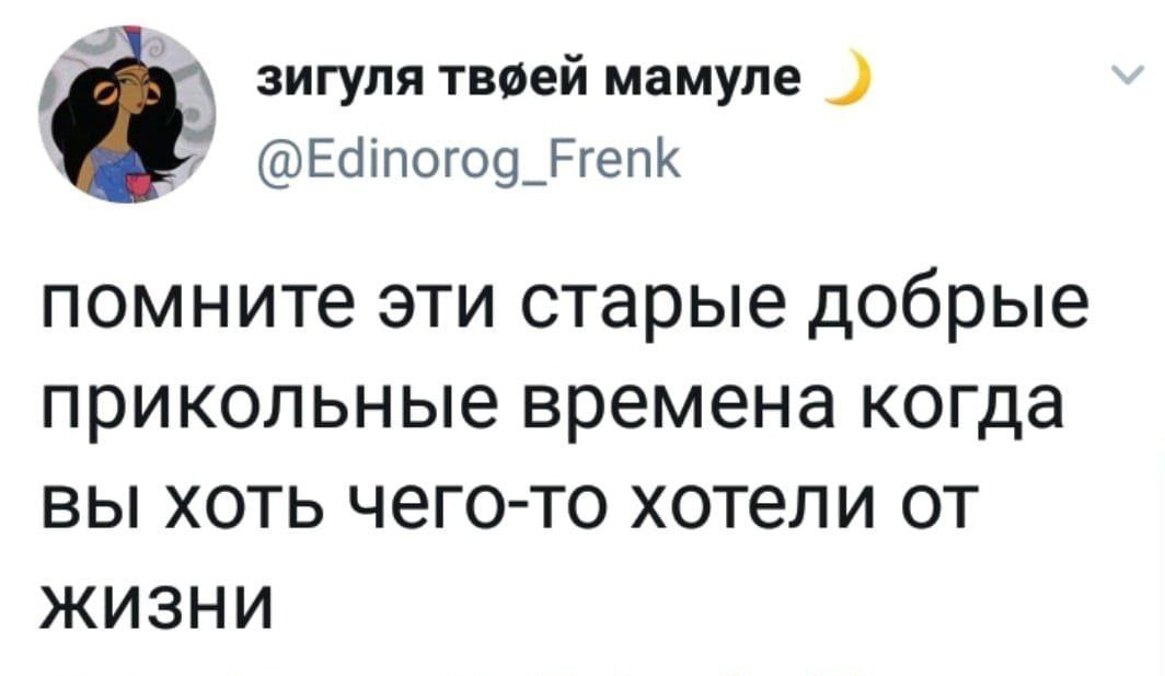 Мем представляет собой скриншот из Твиттера, на котором пользователь "Зигуля твоей мамуле" с ником @Edinorog_Frenk пишет о ностальгии. В тексте твита спрашивается: "Помните эти старые добрые прикольные времена, когда вы хоть чего-то хотели от жизни". Это отражает чувство апатии и потери целей, знакомое многим в современном мире, когда повседневность может "затянуть" и лишить мотивации. Изображение профиля пользователя представляет собой иллюстрацию женщины с длинными темными волосами, в синем платье, держащей бокал вина. На ее голове своеобразный головной убор, напоминающий корону.