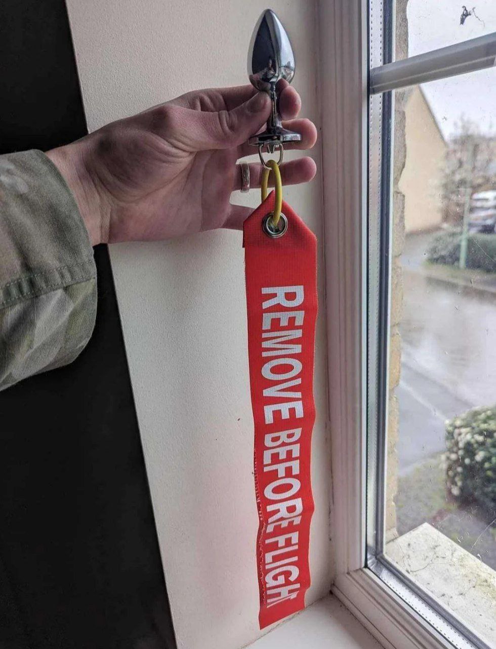 На изображении показана человеческая рука, держащая анальную пробку из блестящего металла. К основанию пробки прикреплен красный текстильный брелок с надписью "REMOVE BEFORE FLIGHT" (Снять перед полетом). Рука находится рядом с окном, из которого виден размытый пейзаж с деревьями и домами. Обстановка напоминает домашнюю или офисную. Использование надписи "REMOVE BEFORE FLIGHT", которая обычно встречается на чеках безопасности в авиации, в контексте анальной пробки создает юмористический и неожиданный эффект, подчеркивая "важность" удаления предмета перед определенным "полетом" или событием.