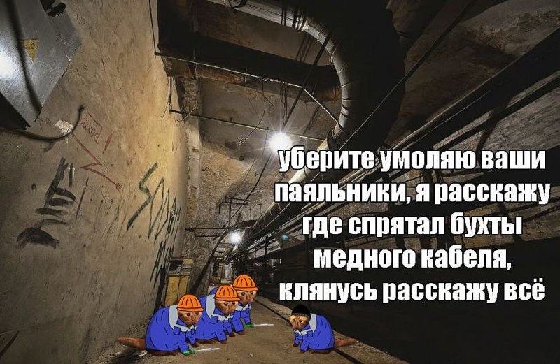 На картинке изображен темный, заброшенный подвал или туннель, стены которого покрыты граффити и следами времени. Вдоль потолка тянутся трубы и коммуникации. На полу сидят несколько котов в синих строительных комбинезонах и оранжевых касках, похожих на рабочих. Перед ними лежит один кот в такой же униформе, но без каски, который выглядит напуганным. Над испуганным котом находится надпись: «Уберите, умоляю, ваши паяльники, я расскажу, где спрятал бухты медного кабеля, клянусь, расскажу всё». Эта надпись переводится как «Уберите, умоляю, ваши паяльники, я расскажу, где спрятал бухты медного кабеля, клянусь, расскажу всё». Мем обыгрывает ситуацию допроса или пытки, где кот под угрозой паяльников готов выдать местонахождение спрятанного медного кабеля, который часто становится объектом кражи.