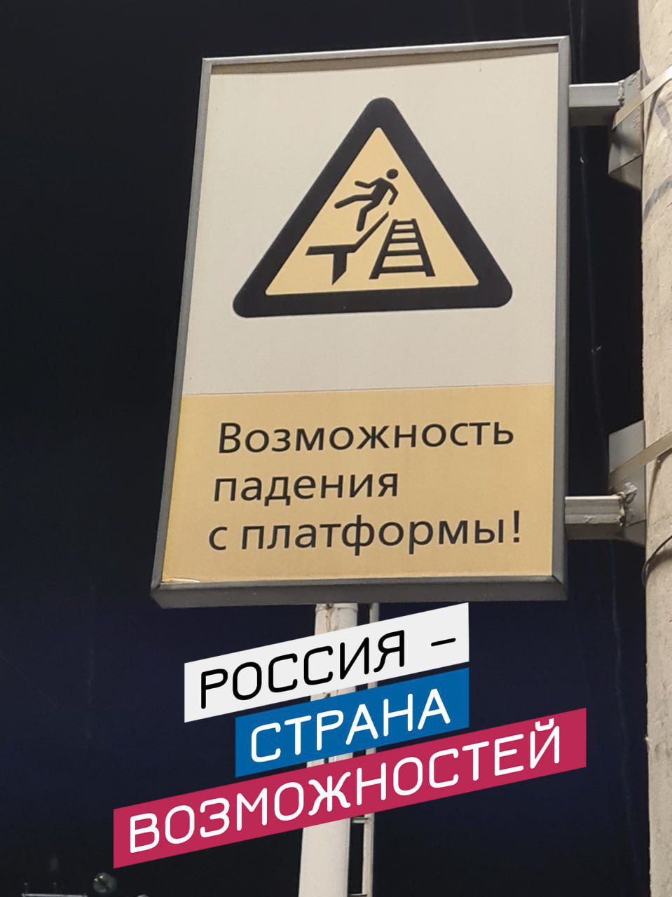 На изображении виден дорожный знак, предупреждающий о возможности падения с платформы, с пиктограммой человека, падающего с уступа. Ниже знака, на синем фоне, крупными белыми, синими и красными буквами написано: "Россия - страна возможностей". Это создает саркастический контраст между предупреждением об опасности и лозунгом, что часто используется в мемах для ироничного комментирования ситуации в стране. Мем "Россия - страна возможностей" с этим знаком является ироничным комментарием, подчеркивающим несоответствие между официальной риторикой и реальным положением дел. Предупреждение о падении с платформы символизирует различные трудности или "ловушки", с которыми можно столкнуться, в то время как лозунг "страна возможностей" звучит как насмешка над этими трудностями.