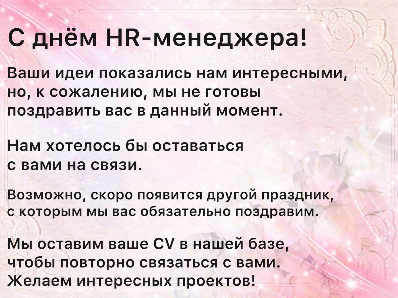 На изображении представлен мем с текстом на розово-белом фоне, стилизованным под праздничную открытку. Главное сообщение мема — это ироничное поздравление с Днём HR-менеджера, которое имитирует типичный отказ в трудоустройстве. В тексте сказано, что идеи кандидата (HR-менеджера) были интересны, но его не готовы поздравить сейчас, однако хотели бы оставаться на связи. Также упоминается, что «скоро появится другой праздник», с которым его обязательно поздравят, и что его резюме оставят в базе для повторной связи, пожелав при этом интересных проектов. Все это написано на фоне с легкими блестками и размытыми цветочными узорами, что усиливает контраст между праздничным оформлением и содержанием отказа. Мем высмеивает типичные формулировки отказа в работе, которые часто используются HR-специалистами, но переносит их в контекст поздравления с праздником.
