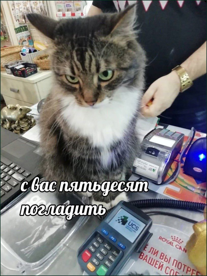 На фото запечатлен крупным планом очень пушистый полосатый кот с белой грудкой, который сидит на кассе магазина, предположительно зоотоваров. Он смотрит прямо перед собой с весьма недовольным выражением мордочки, его уши прижаты, а зеленые глаза слегка прищурены. Рядом с ним на прилавке лежат различные предметы, включая ноутбук, терминал для оплаты банковских карт и принтер для чеков. Справа видна рука человека, который что-то делает за кассой. На переднем плане, поверх изображения, нанесена крупная белая надпись: «С вас пятьдесят погладить», которая означает, что за возможность погладить этого кота нужно заплатить пятьдесят условных единиц. В переводе на русский язык фраза означает: "С вас пятьдесят погладить". Этот мем иронично обыгрывает ситуацию, где общение с животным, особенно таким угрюмым, может "стоить денег". Выражение морды кота только усиливает комический эффект, создавая впечатление, что он действительно "работает" на кассе и требует плату за свою компанию или за возможность прикоснуться к нему. Мем может использоваться для обозначения ситуаций, когда что-то кажущееся бесплатным или простым на самом деле требует оплаты или усилий.