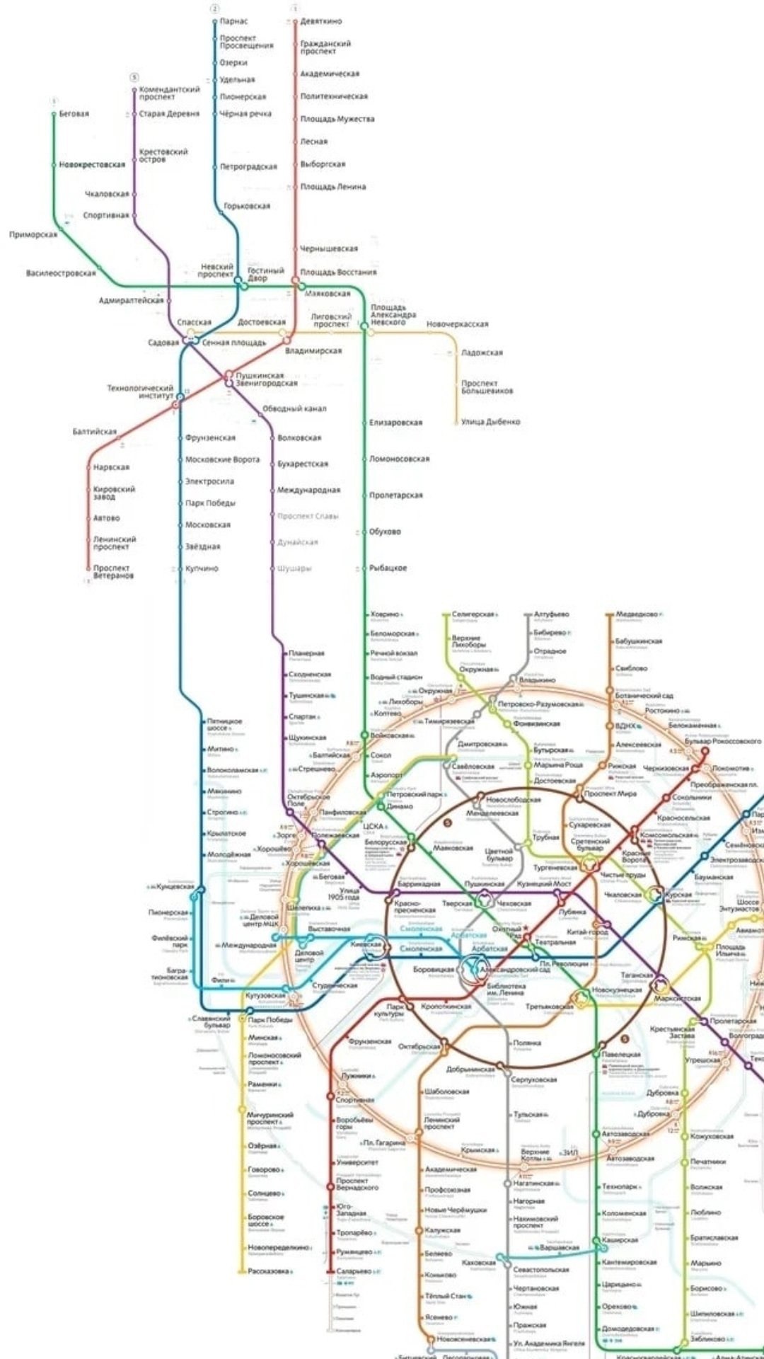На изображении представлена сравнительная схема метрополитена Санкт-Петербурга и Москвы. Слева изображена карта метро Санкт-Петербурга с характерными для него линиями и станциями, такими как "Невский проспект", "Гостиный двор", "Василеостровская" и другие. Справа показана гораздо более обширная и сложная схема Московского метрополитена с его многочисленными кольцевыми и радиальными линиями, а также множеством станций, включая "Киевская", "Пушкинская", "Комсомольская" и другие. Общая композиция намекает на значительную разницу в масштабах и сложности двух крупнейших метрополитенов России.