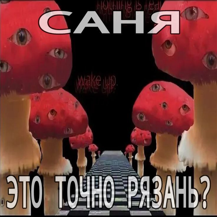 На изображении представлено сюрреалистичное пространство с черным фоном, напоминающим бездонную пустоту. В центре композиции находится длинная, уходящая вдаль шахматная дорожка, создающая иллюзию бесконечности. По обе стороны от дорожки расположены крупные красные грибы с белыми ножками, шляпки которых усеяны множеством человеческих глаз, смотрящих в разные стороны. Глаза придают грибам жутковатый и мистический вид. Над грибами видны полупрозрачные надписи на английском языке: «Nothing is real» (Ничто не реально) и «Wake up» (Проснись). В верхней части изображения крупными буквами написано «САНЯ», а в нижней части, частично перекрывая дорожку, находится вопрос «ЭТО ТОЧНО РЯЗАНЬ?». Мем создает атмосферу абсурда и недоумения, играя на контрасте между обыденным вопросом о Рязани и психоделическим, полным глаз миром грибов. Этот мем часто используется для выражения растерянности или ощущения нереальности происходящего, когда человек сталкивается с чем-то очень странным или неожиданным, как бы спрашивая: «Это точно Рязань?» (Is this definitely Ryazan?) в попытке осмыслить сюрреалистичную ситуацию.