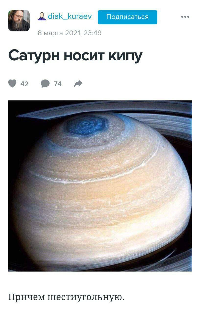 На изображении представлен пост из социальной сети, предположительно из "ВКонтакте" или аналогичной платформы. Верхняя часть поста содержит информацию об авторе – "diak_kuraev" с его аватаркой, а также дату публикации: "8 марта 2021, 23:49". Под этой информацией расположен заголовок поста: "Сатурн носит кипу". Ниже заголовка видно изображение планеты Сатурн, крупным планом показывающее ее северный полюс с характерным шестиугольным штормом и кольцами. На кольцах планеты видны тени. В самом низу поста расположена подпись: "Причем шестиугольную". Таким образом, весь пост представляет собой шутку или интересное наблюдение о схожести формы шторма на Сатурне с еврейским головным убором – кипой, и уточнение, что она еще и шестиугольная.