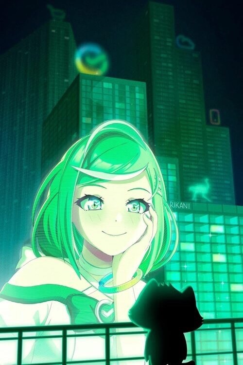 На изображении показана аниме девушка с ярко-зелеными волосами и глазами, которая выглядит счастливой и довольной, опираясь подбородком на руку. Весь фон выполнен в киберпанк-эстетике, где высотные здания подсвечены зеленым светом, придавая изображению футуристический вид, напоминающий кадр из фильма «Бегущий по лезвию». Рядом с ней, на балконе или подоконнике, стоит силуэт черного кота, который смотрит на нее. На одном из зданий виднеется название «RIKANi», а на другом — светящийся логотип, похожий на галочку или букву «C». Эта сцена обыгрывает популярное название «СберТян» для зеленой аниме девушки и «СберКот» для кота, ассоциируя их с экосистемой Сбербанка.
