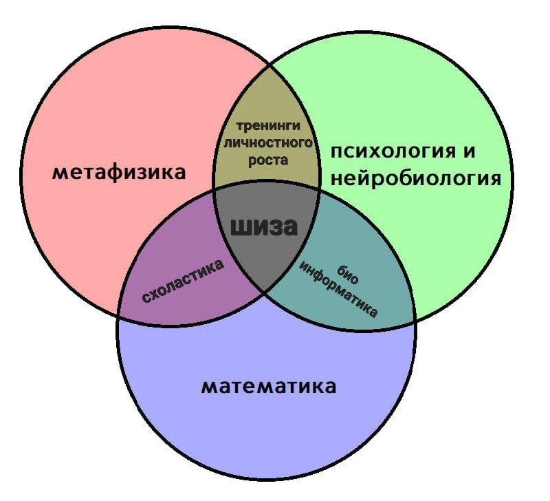На изображении представлена диаграмма Эйлера, состоящая из трех пересекающихся кругов. Каждый круг обозначает одну из областей знаний: «метафизика» (красный), «психология и нейробиология» (зеленый) и «математика» (синий). Пересечения этих кругов также подписаны, обозначая смежные дисциплины, например, «тренинги личностного роста» на пересечении метафизики и психологии, «схоластика» на пересечении метафизики и математики, и «биоинформатика» на пересечении психологии и математики. В самом центре, на пересечении всех трех областей, расположено слово «шиза». Это юмористический мем, который подразумевает, что слишком глубокое погружение во все эти дисциплины одновременно может привести к ментальному расстройству или, по крайней мере, к очень необычному мышлению.
