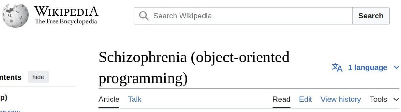 WIKIPEDIA. The Free Encyclopedia. Search Wikipedia. Search. Schizophrenia (object-oriented programming). 1 language. Article. Talk. Read. Edit. View history. Tools.