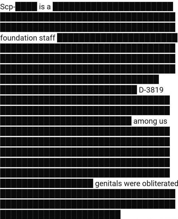 Scp- is a foundation staff. D-3819 among us. Genitals were obliterated.