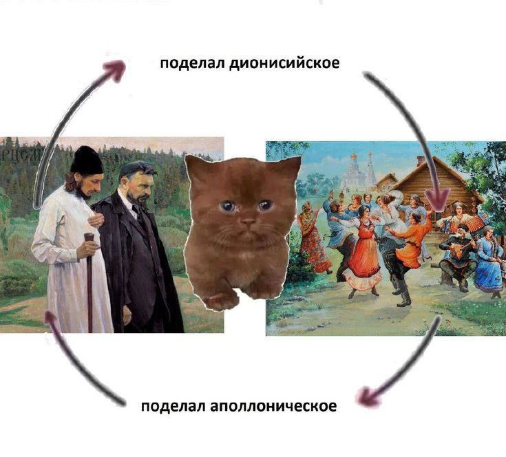 На картинке изображен забавный коричневый котенок, который стоит посередине между двумя сценами, каждая из которых относится к одной из концепций Ницше — дионисийскому и аполлоническому. Слева находится картина с двумя мужчинами в одежде, символизирующей аполлоническое начало (порядок, разум), а справа — сцена с танцующими людьми в народных костюмах, олицетворяющая дионисийское начало (хаос, страсть). Над дионисийской частью находится текст "поделал дионисийское", а над аполлонической – "поделал аполлоническое", с нарисованными стрелками, указывающими на эти сцены, образующими цикличный процесс. Это может символизировать, как котик (или человек) переключается между этими двумя состояниями, между рациональным и эмоциональным, между порядком и хаосом, постоянно возвращаясь к тому или другому.
