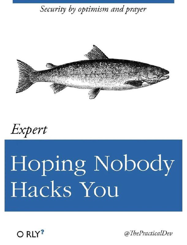 Мем оформлен в стиле обложки книги O'Reilly с классической иллюстрацией рыбы на белом фоне. Над рыбой находится заголовок "Security by optimism and prayer", что в переводе означает "Безопасность благодаря оптимизму и молитве". Под иллюстрацией рыбы расположен крупный синий блок с белым текстом "Hoping Nobody Hacks You", который переводится как "Надеясь, что никто вас не взломает". Внизу слева можно увидеть фирменный логотип "O RLY?", а справа — надпись "@ThePracticalDev". Этот мем иронично показывает наивный подход к кибербезопасности, когда вместо реальных мер защиты люди полагаются на удачу и оптимизм, лишь надеясь, что их системы не будут взломаны.