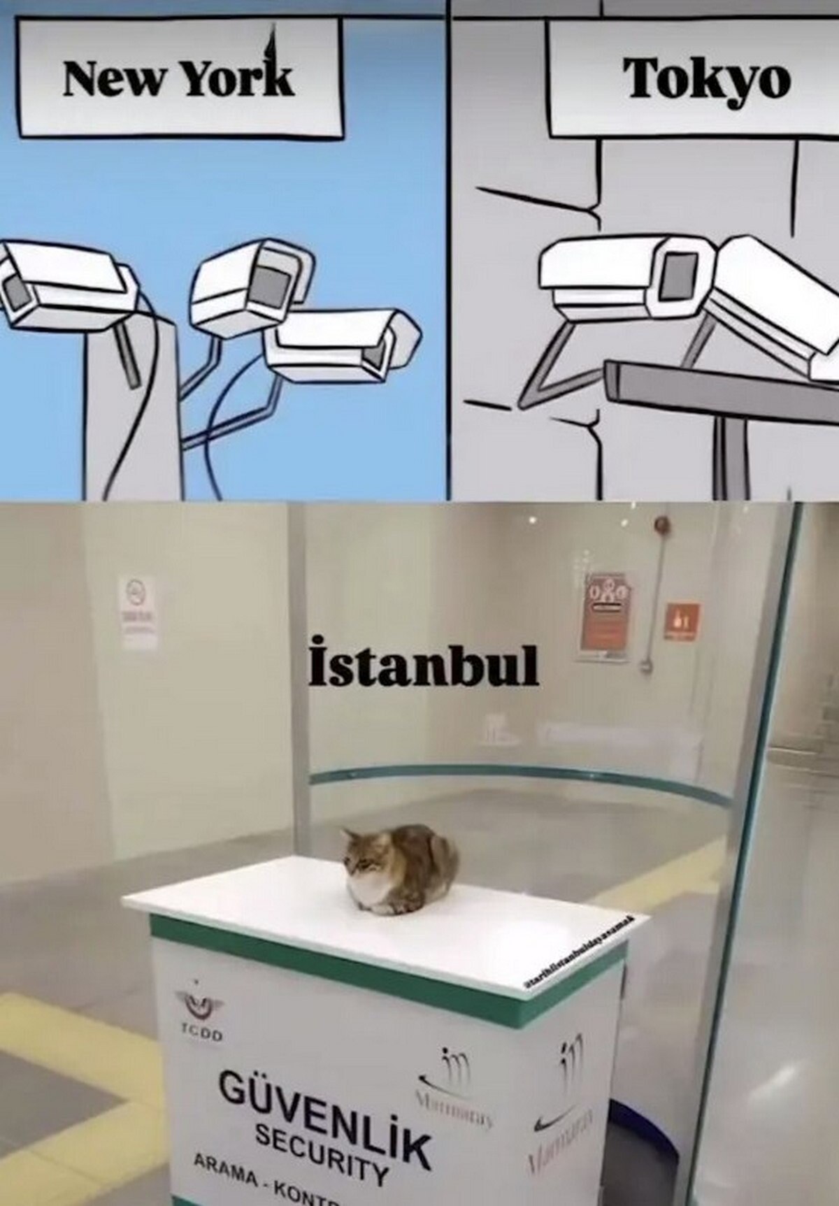 Мем состоит из двух частей. В верхней части, выполненной в мультяшном стиле, показаны системы безопасности в Нью-Йорке и Токио. В Нью-Йорке изображены три камеры видеонаблюдения, направленные в разные стороны. В Токио две камеры, одна из которых стоит на столе, а другая висит на стене. Нижняя часть мема, представленная как реальная фотография, демонстрирует систему безопасности в Стамбуле: на белой стойке с надписью "Güvenlik Security" (Безопасность) спокойно лежит пушистый полосатый кот, охраняющий вход. Это забавно показывает контраст между технологичными системами и простым, но эффективным "охранником" в Стамбуле.