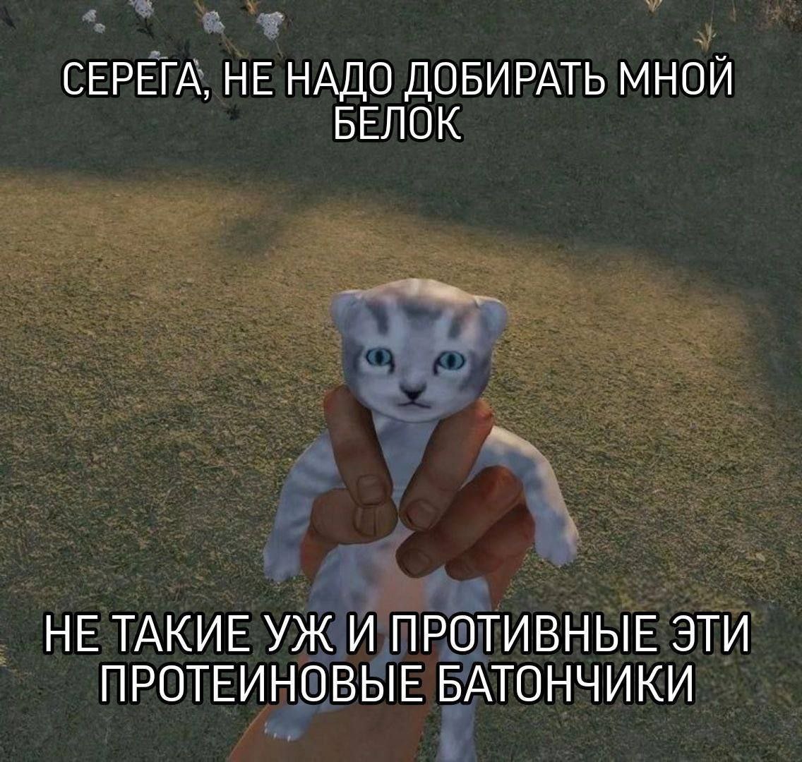 На меме изображен маленький котенок с серо-белой полосатой шерстью и большими голубыми глазами, которого держат за туловище две человеческие руки. Фон представляет собой размытое изображение травы или земли. Над головой котенка и под ним расположены надписи. Этот мем часто используется для шуток про людей, которым не хватает белка в рационе, и они готовы его «добывать» любыми способами, даже из милых животных. Также он применяется в ситуациях, когда кто-то предлагает нечто неприятное или неудобное, но утверждает, что это «не так уж и плохо». В целом, мем «Серега, не надо добивать мной белок» часто используется в юмористических контекстах, связанных с питанием, спортом или просто в ситуациях, где кто-то предлагает нечто "не очень" приятное, но пытается убедить в обратном. Перевод фразы «Не такие уж и противные эти протеиновые батончики» означает, что протеиновые батончики не такие уж и отвратительные.