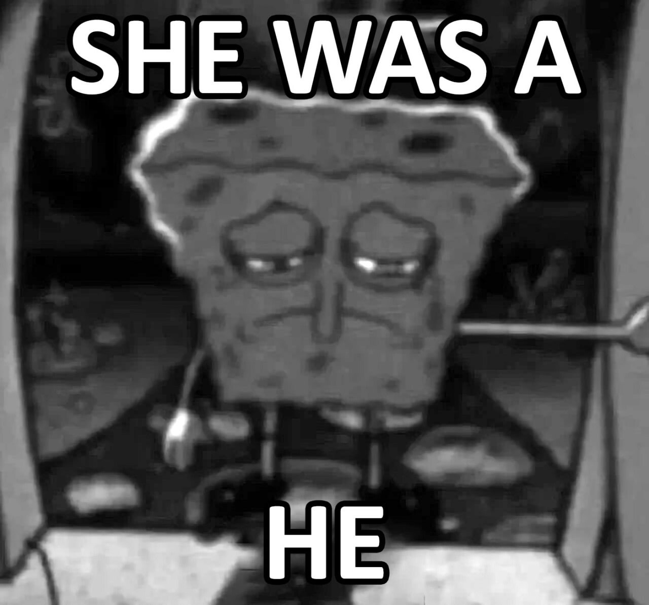 На изображении представлен грустный Спанч Боб Квадратные Штаны в черно-белых тонах. Он выглядит подавленным, его глаза опущены, а лицо выражает печаль. Надпись на изображении гласит «She was a he» (Она была им).