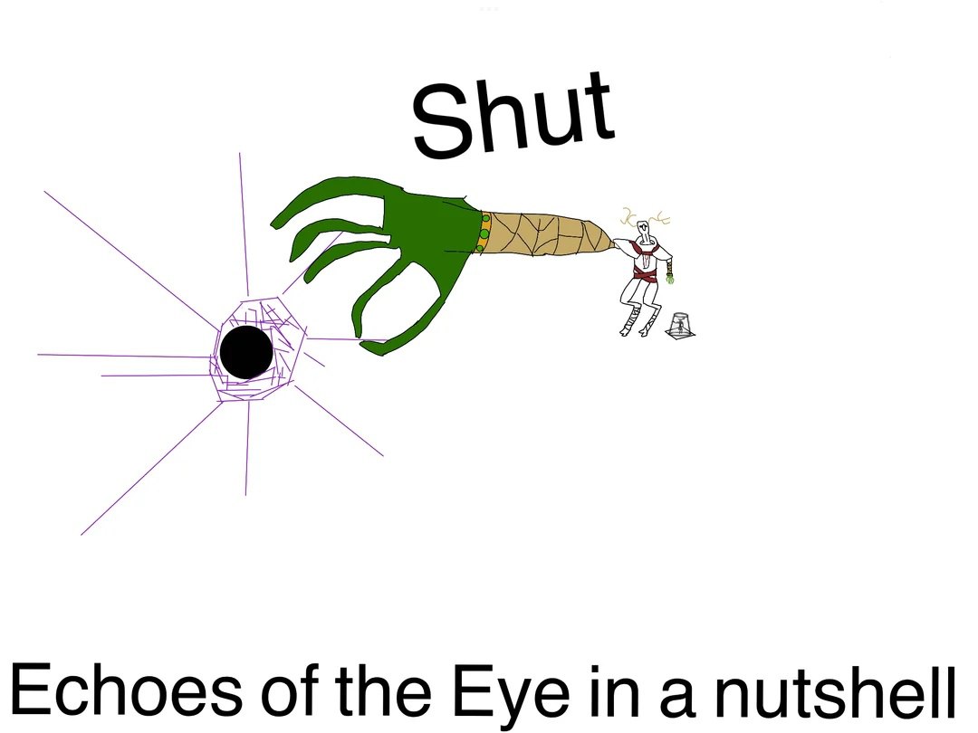 На картинке изображена огромная зеленая рука, которая закрывает или затыкает черный портал, окруженный фиолетовыми лучами. Справа от руки маленький белый человечек с рогами. Над рукой написано слово «Shut» (Заткнись), а внизу — «Echoes of the Eye in a nutshell» (Краткое содержание дополнения Echoes of the Eye). Мем обыгрывает идею дополнения "Echoes of the Eye" к игре "Outer Wilds", где главный герой сталкивается с нечто, что по сюжету нужно "заткнуть" или "закрыть". Эта абсурдная и упрощенная визуализация передает суть напряженного и порой пугающего опыта игры.