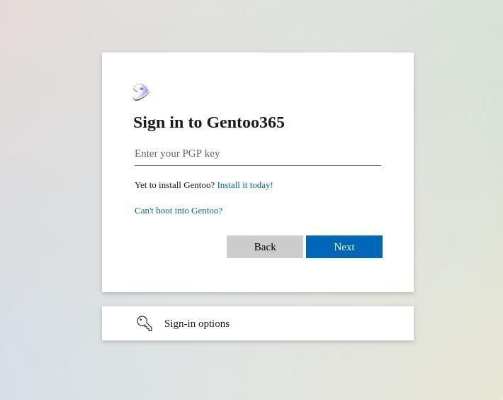 Sign in to Gentoo365. Enter your PGP key. Yet to install Gentoo? Install it today! Can't boot into Gentoo? Back. Next. Sign-in options.