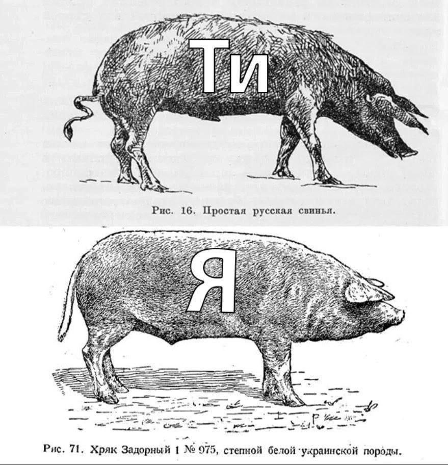 На изображении показаны две гравюры свиней из старых книг или научных изданий. Верхняя гравюра подписана как «Рис. 16. Простая русская свинья» с белой надписью «Ты» на теле свиньи. Нижняя гравюра подписана как «Рис. 71. Хряк Задорный 1 № 975, степной белой украинской породы» с белой надписью «Я» на теле свиньи. Мем сравнивает простую русскую свинью с хряком Задорным.