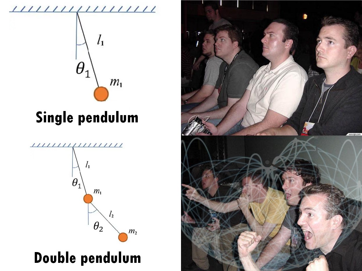 Мем разделён на две части. Слева показаны два типа маятников: "single pendulum" (одинарный маятник) и "double pendulum" (двойной маятник), каждый со своей схемой. Одинарный маятник выглядит просто и предсказуемо, в то время как двойной маятник демонстрирует более сложную и непредсказуемую динамику. Справа изображена реакция мужчин на эти маятники: на одинарный маятник они смотрят равнодушно и скучно, а на двойной маятник они реагируют с полным восторгом, удивлением и неподдельным интересом, их лица искажены от эмоций, а вокруг их голов видны линии, символизирующие мысли или сложную динамику. Мем "Single pendulum, Double pendulum" высмеивает разницу в интересе и реакции на простые и сложные системы или явления. Когда речь заходит о чём-то простом и очевидном, люди остаются равнодушными, но когда появляется что-то сложное, непредсказуемое и захватывающее, их реакция становится бурной и эмоциональной. Он часто используется для сравнения двух разных ситуаций, где одна из них очевидна и неинтересна, а другая — сложна, но гораздо более увлекательна.