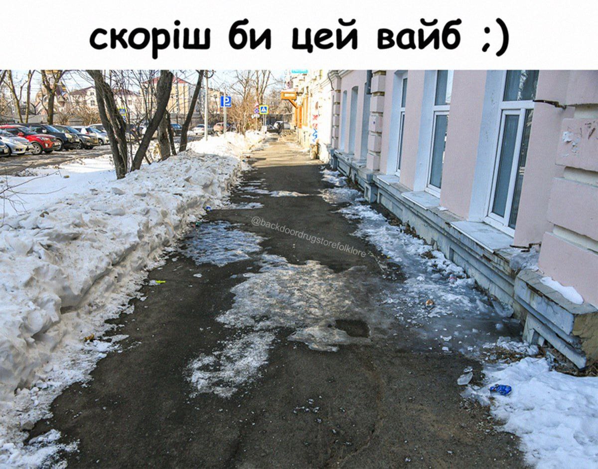 На изображении показан типичный городской пейзаж ранней весны, когда снег активно тает. Тротуар покрыт подтаявшей грязью и лужами, смешанными со снегом и льдом. Слева от тротуара находится большая куча грязного снега, а за ней видны припаркованные автомобили и деревья без листвы. Справа расположено здание с несколькими окнами, вдоль которого также лежат остатки снега и льда. Общая атмосфера передает ожидание прихода полноценной весны и теплой погоды. Надпись на меме на украинском языке «скоріш би цей вайб :)» переводится как «скорее бы этот вайб :)», что выражает желание скорее ощутить атмосферу настоящей весны, когда снег полностью сойдет, а улицы станут чистыми и сухими.