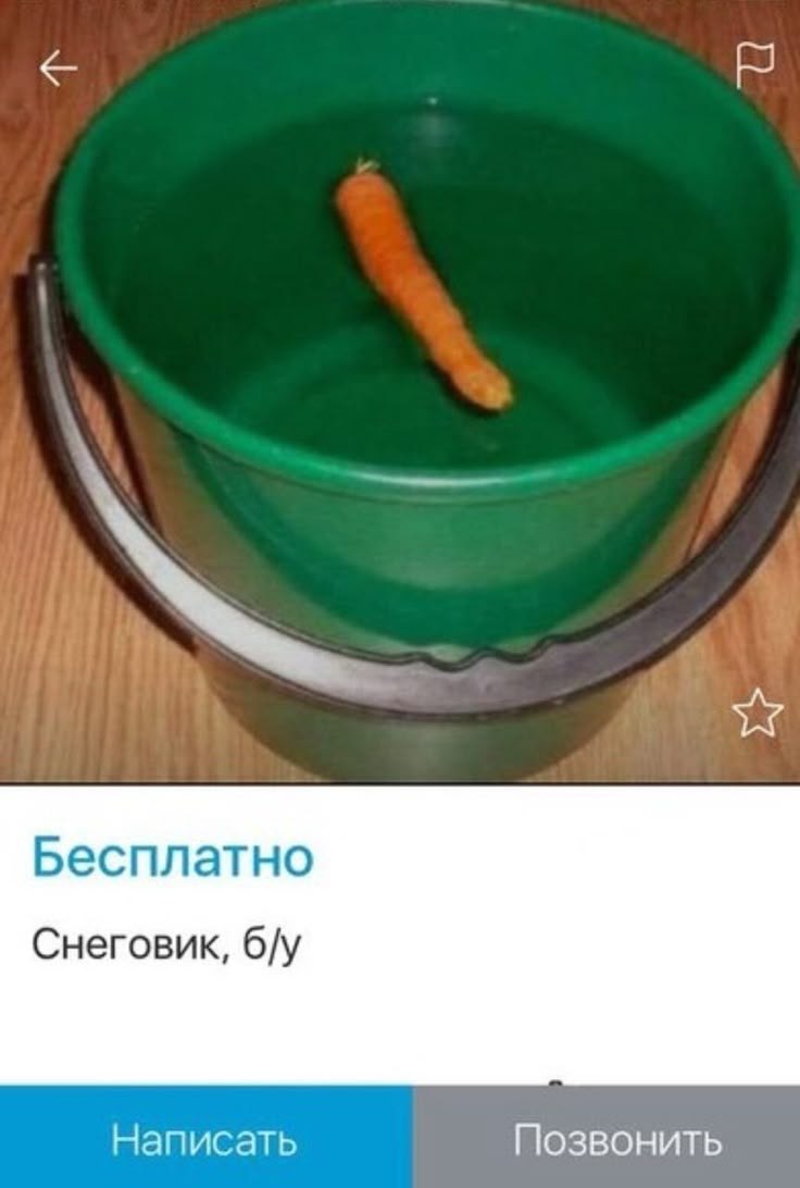 На изображении показан скриншот объявления с сайта, вероятно, Авито. В объявлении написано «Бесплатно» и «Снеговик, б/у». Главная часть изображения — это фотография, на которой в зеленом ведре с водой плавает одна морковка. Эта морковка символизирует нос снеговика, а вода в ведре подразумевает растаявшего снеговика. Объявление явно юмористическое, обыгрывающее тему того, что от снеговика после таяния остаётся только морковка. Мем "Снеговик, б/у" демонстрирует находчивость и чувство юмора человека, который решил продать остатки снеговика. Это является отсылкой к ситуации, когда человек не хочет расставаться со своими вещами даже после их "утилизации". Объявление иронизирует над типичными объявлениями о продаже на таких платформах, предлагая "бесплатно" то, что уже по сути исчезло.
