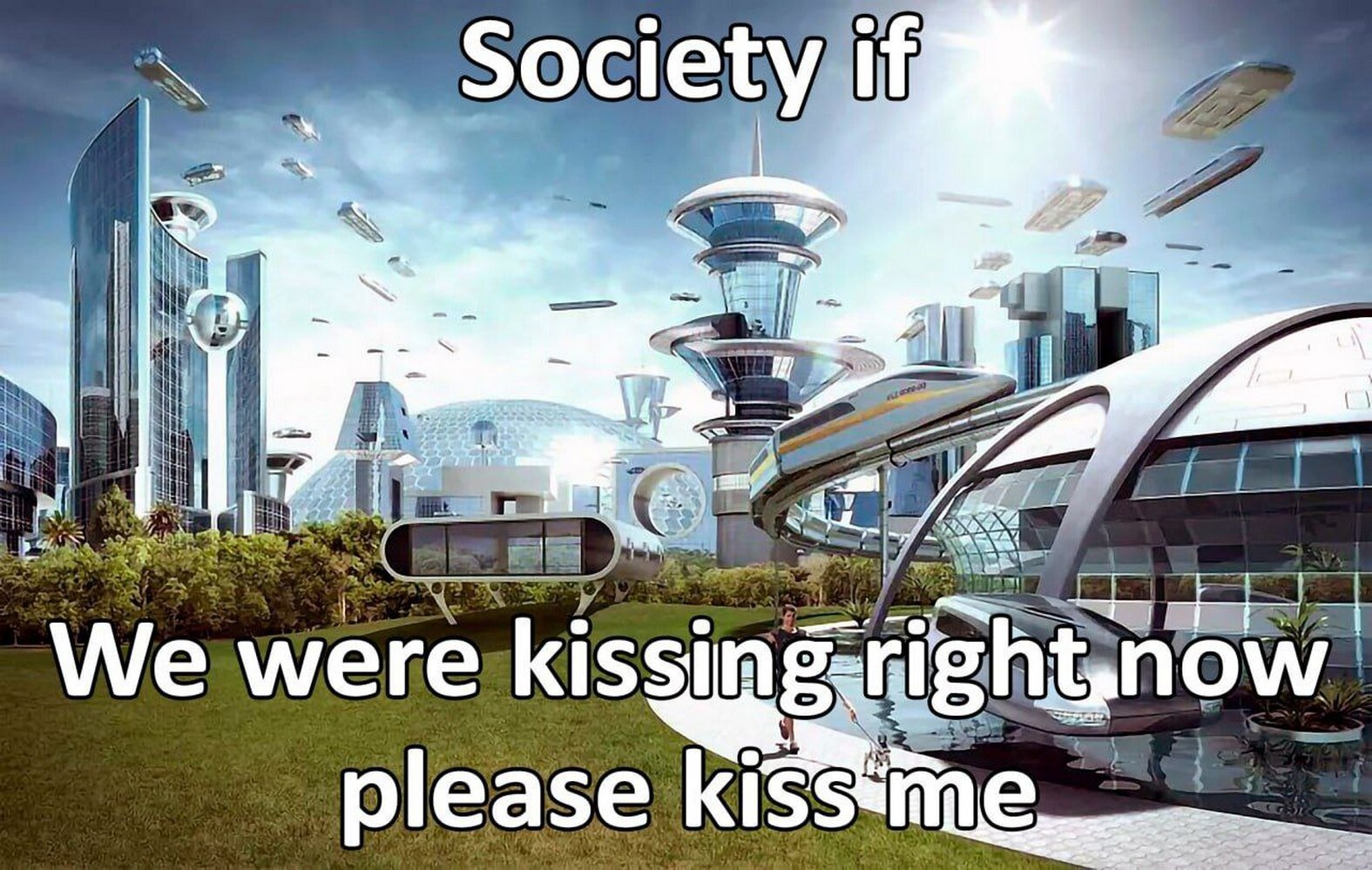 Мем "Society if we were kissing right now, please kiss me" (Общество, если бы мы целовались прямо сейчас, пожалуйста, поцелуй меня) на футуристическом фоне показывает утопический город будущего с небоскребами, летающими машинами и монорельсом, как символ идеального мира. Этот образ используется для создания контраста с несбыточной мечтой о романтическом моменте. Мем выражает желание поцеловаться, представляя это как ключ к идеальному обществу.