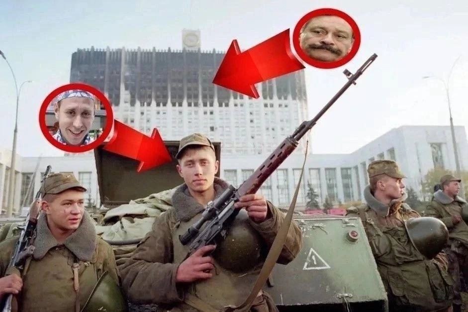 На переднем плане изображения — группа молодых солдат в военной форме, стоящих на фоне бронетранспортера. Центральный солдат, с винтовкой СВД и оптическим прицелом, держит её в руках и смотрит прямо на зрителя. Слева от него стоит другой солдат, улыбающийся, а справа видны ещё двое солдат. На заднем плане возвышается большое многоэтажное здание, которое, возможно, является административным. Поверх изображения наложены два красных круга с портретами: один с изображением человека с усами, другой с изображением улыбающегося молодого человека, и красные стрелки, указывающие на солдат. Этот мем намекает на то, что эти люди похожи на известных людей или исторических личностей.