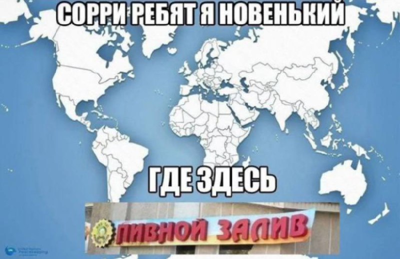 На картинке изображена карта мира с белыми контурами континентов на голубом фоне, символизирующем океан. Сверху над картой крупным белым шрифтом с чёрной обводкой написано: «Сорри ребят я новенький», что в переводе с английского и русского означает «Извините, ребята, я новенький». Под картой тем же шрифтом вопрос: «Где здесь», а чуть ниже, наложена фотография вывески магазина с надписью «Пивной Залив». Мем обыгрывает ситуацию, когда новый человек пытается найти какое-то место, в данном случае магазин «Пивной Залив», используя совершенно неподходящий инструмент — карту мира, что выглядит комично и абсурдно.