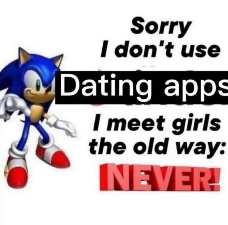 Мем с Соником на белом фоне, который говорит, что не пользуется приложениями для знакомств. Слева на изображении стоит Соник, персонаж видеоигр, с его характерной синей шерстью и красными ботинками. Справа расположен текст на английском языке, выполненный разными шрифтами. Верхняя часть текста гласит: "Sorry I don't use Dating apps" (Извините, я не пользуюсь приложениями для знакомств). Далее идет продолжение: "I meet girls the old way: NEVER!" (Я знакомлюсь с девушками по старинке: НИКОГДА!). Слово "NEVER!" выделено красным объемным шрифтом, подчеркивая ироничность и самоиронию высказывания.