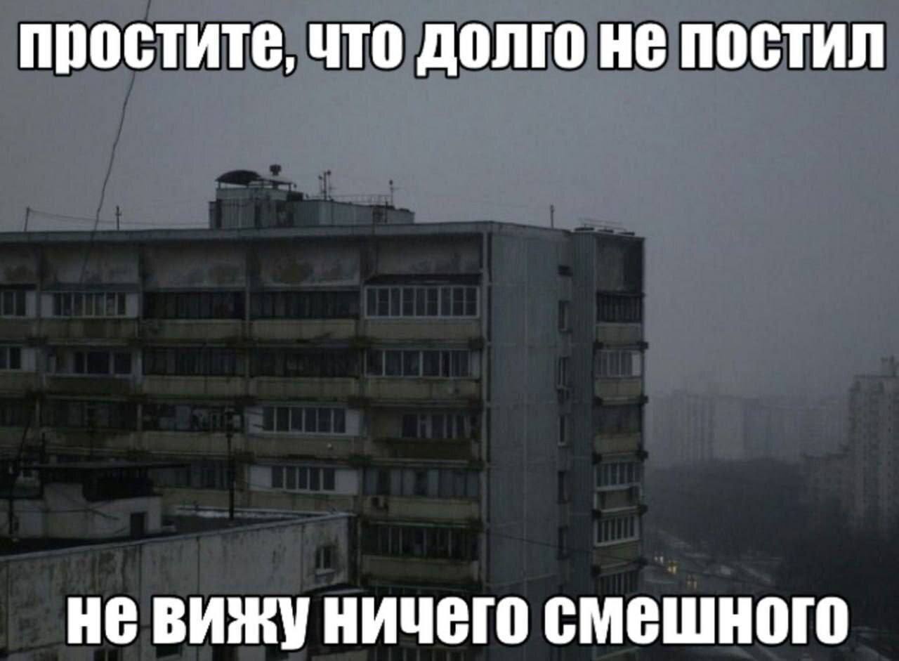 На изображении показана многоэтажка советского типа, вероятно, панельный дом, типичный для российских городов. Здание выглядит довольно уныло и обветшало, с серыми стенами и множеством окон, некоторые из которых имеют балконы. Общая атмосфера усугубляется тусклым, серым небом, создающим впечатление пасмурного дня или раннего утра. Вверху и внизу изображения расположены две белые надписи: "простите, что долго не постил" и "не вижу ничего смешного". Эти фразы добавляют комический или саркастический оттенок к мрачной и унылой картине, подразумевая отсутствие вдохновения или юмора в окружающей действительности. Перевод текста "простите, что долго не постил" означает "sorry I haven't posted in a long time", а "не вижу ничего смешного" переводится как "I don't see anything funny".