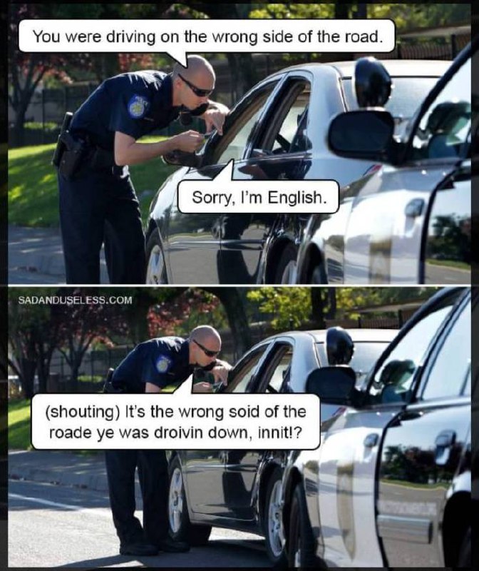 Мем состоит из двух частей. В первой части полицейский, наклонившись к окну машины, говорит водителю, что тот ехал по встречной полосе. Водитель отвечает: "Извините, я англичанин". Во второй части тот же полицейский, видимо, осознав, что он не совсем понял британский акцент и манеру речи, пытается имитировать ее, выкрикивая: "Это неправильная сторона дороги, по которой вы ехали, не так ли?" Он говорит это так, как будто старается быть более понятным для англичанина, но только усугубляет ситуацию, пародируя распространенные стереотипы о британском акценте и английском сленге. Юмор мема заключается в попытке полицейского адаптироваться к британскому акценту, что приводит к комичному эффекту и недопониманию. На картинке показан лысый полицейский в форме и темных очках, наклонившийся к окну серебристого автомобиля. Действие происходит на улице с деревьями на фоне в солнечный день. Рядом с ним виден бок еще одной машины, возможно, его патрульной.