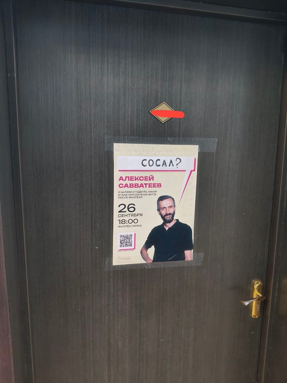 На изображении виден плакат, приклеенный скотчем к темной деревянной двери. В верхней части плаката крупным шрифтом выделен вопрос "СОСАЛ?". Ниже на плакате анонсируется выступление Алексея Савватеева на тему "О жизни до, и после, и как нам дальше жить после физтеха", которое состоится 26 сентября в 18:00 в Физтех.Гараже. Рядом с информацией изображен портрет Алексея Савватеева в черной футболке. Из-за неудачной композиции, кажется, будто вопрос "СОСАЛ?" обращен к нему. Снизу размещен QR-код.