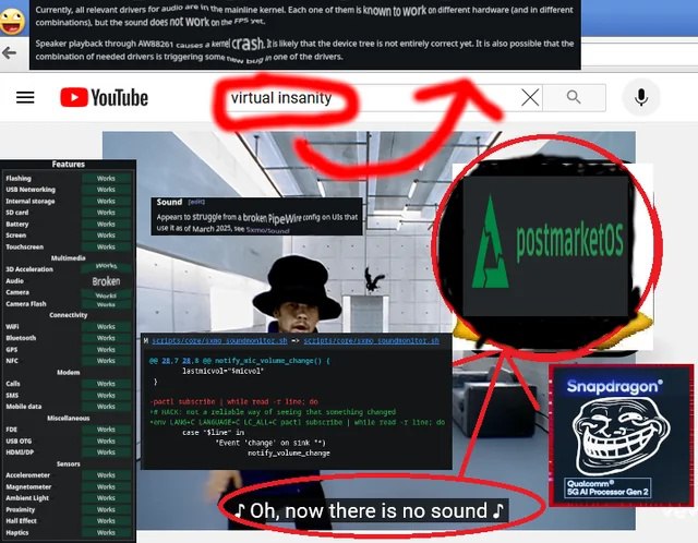 На изображении показан скриншот рабочего стола с элементами, указывающими на проблемы со звуком в операционной системе postmarketOS, работающей на процессоре Snapdragon. Вверху экрана видно сообщение о том, что звук «не работает» из-за проблем с драйверами. Ниже находится поисковая строка YouTube с запросом «virtual insanity» и видео с Jamiroquai, что является отсылкой к популярному клипу, где он танцует в движущейся комнате. На одном из блоков видно логотип postmarketOS, а рядом — логотип Snapdragon 5G AI Processor Gen 2 с троллфейсом, что символизирует разочарование от неработающего звука. В левой части изображения представлена таблица с функциями, где напротив «Sound» указано «Broken». В нижней части мема присутствует надпись «Oh, now there is no sound», что в переводе означает «О, теперь нет звука», и это подчеркивает основную проблему, с которой сталкивается пользователь.