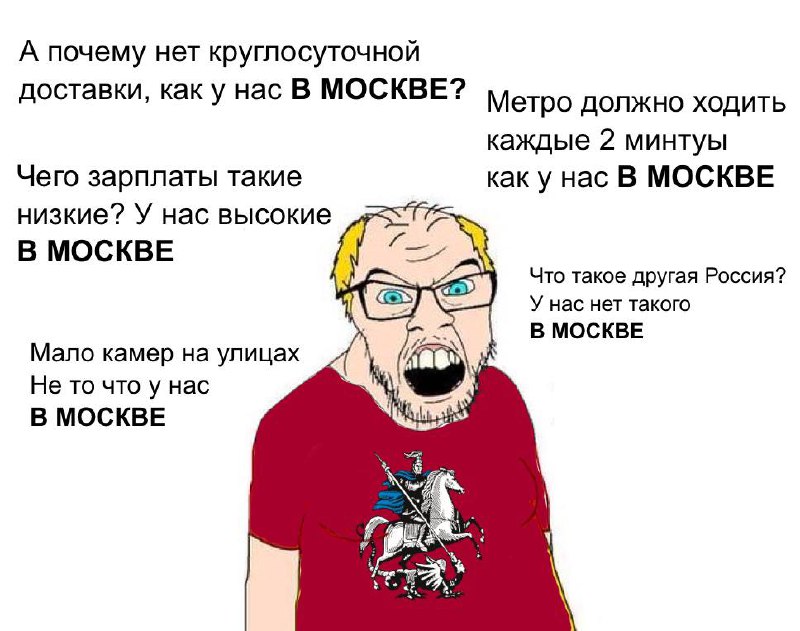 А почему нет круглосуточной доставки, как у нас В МОСКВЕ? Метро должно ходить каждые 2 минуты как у нас В МОСКВЕ. Чего зарплаты такие низкие? У нас высокие В МОСКВЕ. Что такое другая Россия? У нас нет такого В МОСКВЕ. Мало камер на улицах. Не то что у нас В МОСКВЕ.
