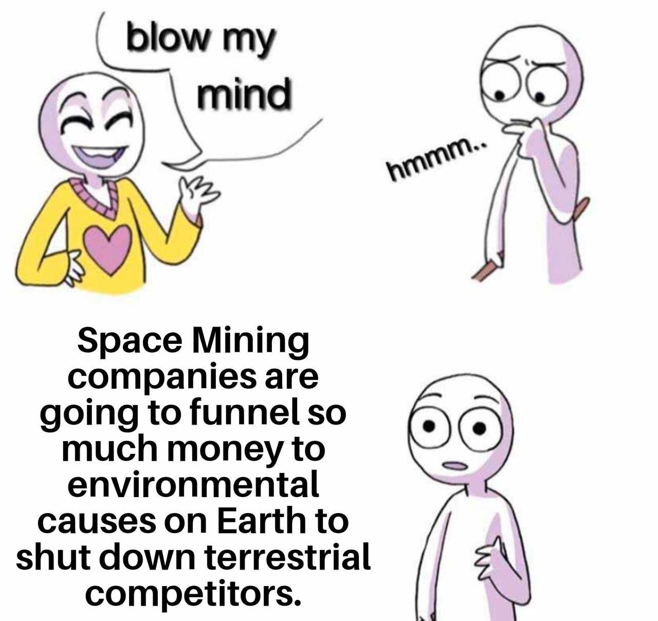 Blow my mind. Hmmm. Space Mining companies are going to funnel so much money to environmental causes on Earth to shut down terrestrial competitors.