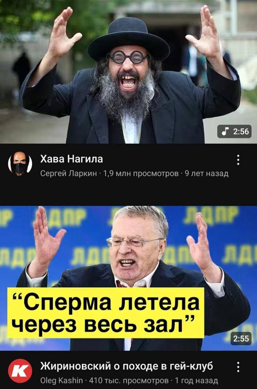 На изображении показан мем, состоящий из двух скриншотов с YouTube. В верхней части — кадр из видео "Хава Нагила" с Сергеем Ларкиным, где запечатлен радостный хасид с длинной бородой и в очках, поднявший руки вверх. Он широко раскрыл рот в крике или смехе. В нижней части — кадр из видео "Жириновский о походе в гей-клуб" с Олегом Кашиным. На этом скриншоте виден Владимир Жириновский, также поднявший руки вверх, но с явно возмущенным выражением лица. На яркой желтой плашке поверх его изображения крупным шрифтом написано: "Сперма летела через весь зал", что является цитатой из его выступления. Этот мем сравнивает две схожие позы, но абсолютно разные по смыслу и эмоциональной окраске ситуации.