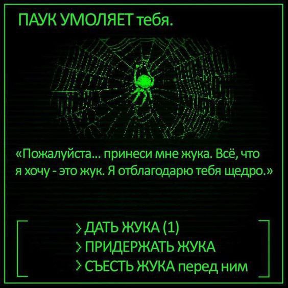 Паук умоляет тебя. "Пожалуйста... принеси мне жука. Всё, что я хочу - это жук. Я отблагодарю тебя щедро." Дать жука (1). Придержать жука. Съесть жука перед ним.