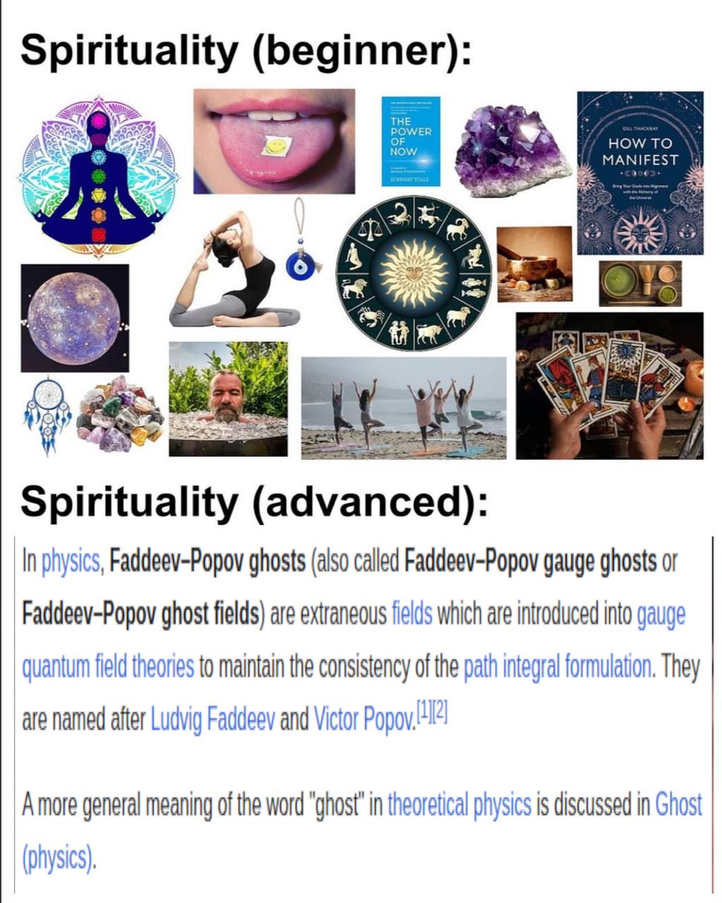 Мем "Spirituality (beginner) vs Spirituality (advanced)" сравнивает два уровня духовности: начинающий и продвинутый. На уровне "для начинающих" показаны популярные атрибуты, ассоциирующиеся с духовными практиками, такие как медитация с чакрами, йога, камни и кристаллы, амулеты, астрология, гадание на картах Таро, чай матча, а также книга "Сила настоящего" Экхарта Толле. Также изображены необычные элементы, такие как марка на языке (возможно, отсылка к психоделикам), планета Меркурий, мужчина, принимающий ванну изо льда или в грязи, и группа людей, занимающихся йогой на пляже. Все эти изображения демонстрируют внешние и широко известные проявления духовности, которые часто используются для самопознания и "просветления". На уровне "для продвинутых" представлен текст на английском языке из научной статьи или энциклопедии, который описывает "духов Фадеева-Попова" (Faddeev-Popov ghosts) в физике. Эти "духи" являются искусственными полями, вводимыми в калибровочные квантовые теории поля для поддержания согласованности в формулировке интеграла по траекториям и названы в честь Людвіга Фадеева и Виктора Попова. Это создает комический эффект, так как "продвинутая духовность" оказывается высокоинтеллектуальным и сложным физическим понятием, которое обычному человеку далеко от традиционного понимания духовности. Мем иронично указывает на то, что истинная глубина или "продвинутость" может быть найдена в совершенно неожиданных и, казалось бы, не связанных с темой областях.