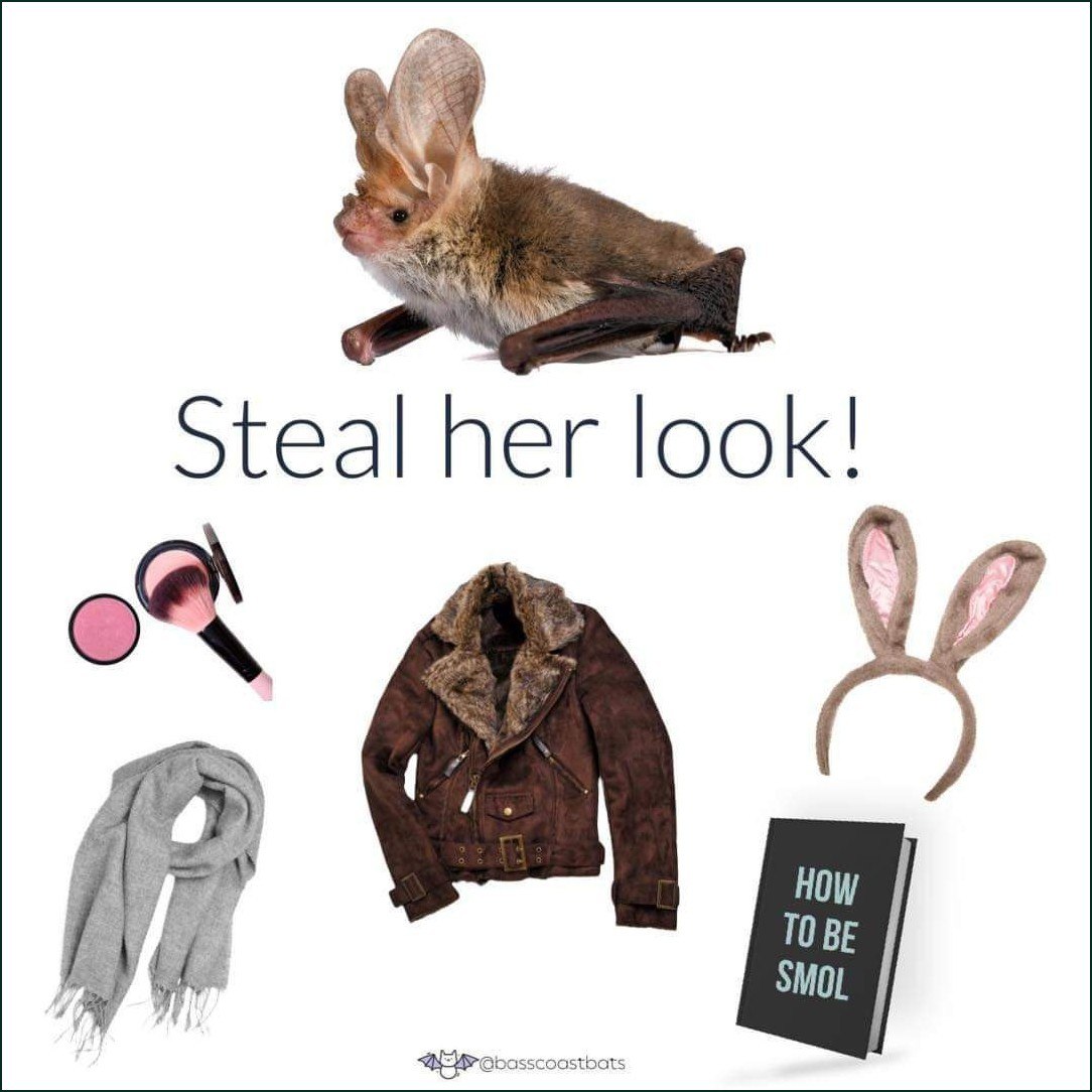 На изображении представлен коллаж с летучей мышью с большими ушами сверху и различными предметами одежды и аксессуарами внизу. Надпись «Steal her look!» («Укради ее образ!») призывает повторить стиль летучей мыши. Среди предметов можно увидеть румяна и кисть, серый шарф, коричневую кожаную куртку с меховым воротником, ободок с заячьими ушами и книгу с названием «How to be smol» («Как быть крошечным»).