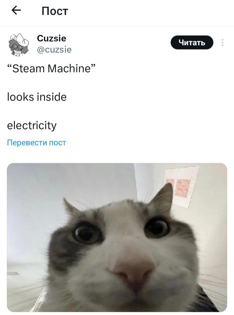На изображении представлен скриншот из Твиттера с забавным мемом. Пользователь под ником Cuzsie написал, что «Паровая машина» внутри выглядит как «электричество», и прикрепил фотографию кота, смотрящего широко раскрытыми глазами прямо в камеру. Мордочка кота занимает большую часть кадра, его глаза кажутся огромными, а нос розовым и влажным. Задний фон размыт, но видны белые стены и что-то похожее на картину или плакат. Мем вызывает улыбку своей абсурдностью и выражением мордочки животного.