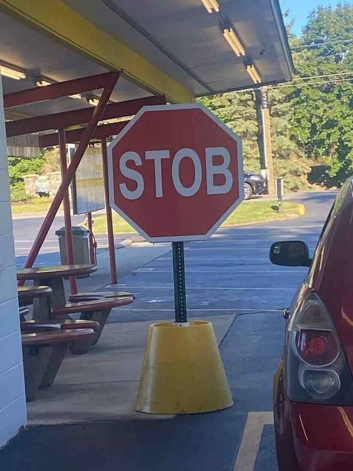 На изображении показан дорожный знак "СТОБ", который установлен на желтом конусообразном основании. Знак выполнен в традиционной красной восьмиугольной форме с белыми буквами, но вместо правильного слова "STOP" написано "STOB". Справа на переднем плане видна часть красного автомобиля, а слева - элементы уличного кафе или закусочной: столики со скамейками и мусорный бак. На заднем плане видны деревья и дорога. Неправильно написанный знак "СТОБ" придает изображению юмористический оттенок, привлекая внимание к забавной ошибке.