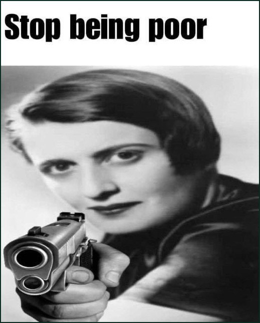 На меме изображена женщина с пистолетом, целящаяся прямо в зрителя. Это чёрно-белое изображение, созданное путём комбинирования фотографии Айн Рэнд и пистолета. Надпись над изображением гласит: "Stop being poor", что переводится как "Перестань быть бедным". Эта фраза часто используется в ироничном или саркастическом контексте, высмеивая наивные или упрощённые решения сложных социальных проблем. Выражение лица женщины на изображении серьёзное и прямолинейное, что добавляет комичности к абсурдному высказыванию.