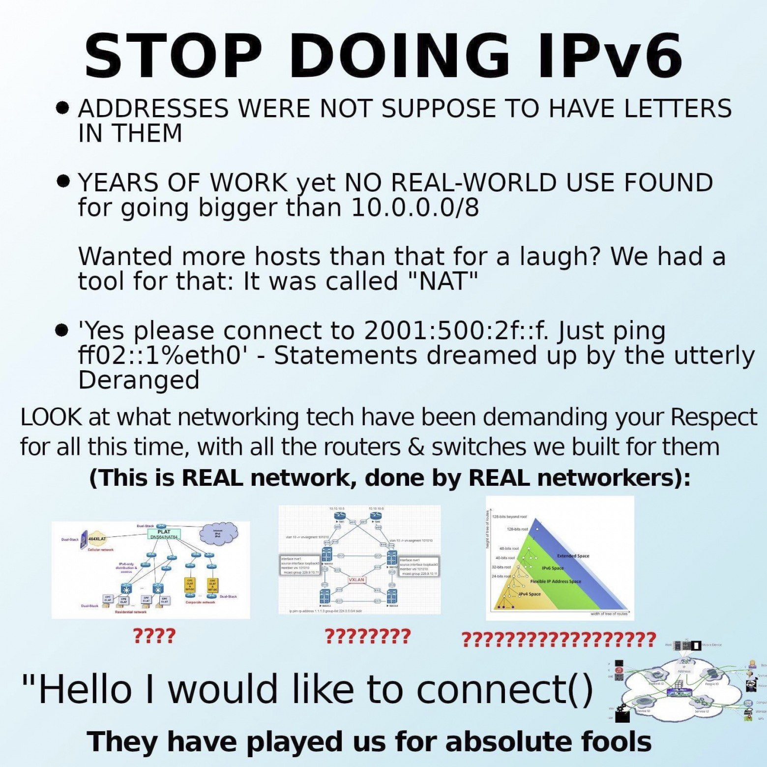 Мем с текстом на английском языке «STOP DOING IPv6» критикует использование протокола IPv6. В меме высказываются аргументы против IPv6, такие как наличие букв в адресах, отсутствие реального применения, достаточная функциональность NAT для увеличения числа хостов, а также сложность подключений. Ниже представлены три диаграммы, изображающие сетевые схемы, и над ними расположены знаки вопроса, выражающие недоумение. В нижней части мема показана сложная схема с множеством элементов, таких как хосты, мобильные устройства, люди, адреса IPv4 и IPv6, сервисы, компьютеры и даже «божественный разум». В конце написано «Hello I would like to connect()» и «They have played us for absolute fools». В целом, мем высмеивает сложность и, по мнению автора, ненужность протокола IPv6, особенно в сравнении с IPv4 и NAT. Он выражает мысль о том, что сетевые инженеры были обмануты или введены в заблуждение относительно преимуществ и необходимости IPv6.