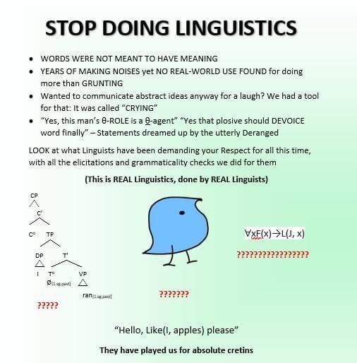 На изображении представлен мем "STOP DOING LINGUISTICS" (Прекратите заниматься лингвистикой), который сатирически критикует академическую лингвистику. В верхней части мема крупными буквами написано "STOP DOING LINGUISTICS". Ниже перечислены пункты, высмеивающие лингвистические концепции, например, "Слова не предназначались для того, чтобы иметь значение" или "Годы издавания звуков, но никакого реального применения, кроме хрюканья". В центральной части изображения показаны сложные и бессмысленные схемы, символы и "грамматические" конструкции, подписанные "(Это НАСТОЯЩАЯ лингвистика, сделанная НАСТОЯЩИМИ лингвистами)", а также простая синяя птичка, олицетворяющая обычное понимание языка. Также на меме присутствует фраза "Hello, Like(I, apples) please", которая, вероятно, должна продемонстрировать абсурдность лингвистических построений. Мем завершается утверждением: "Они играли с нами, как с полными кретинами".